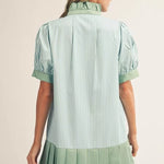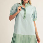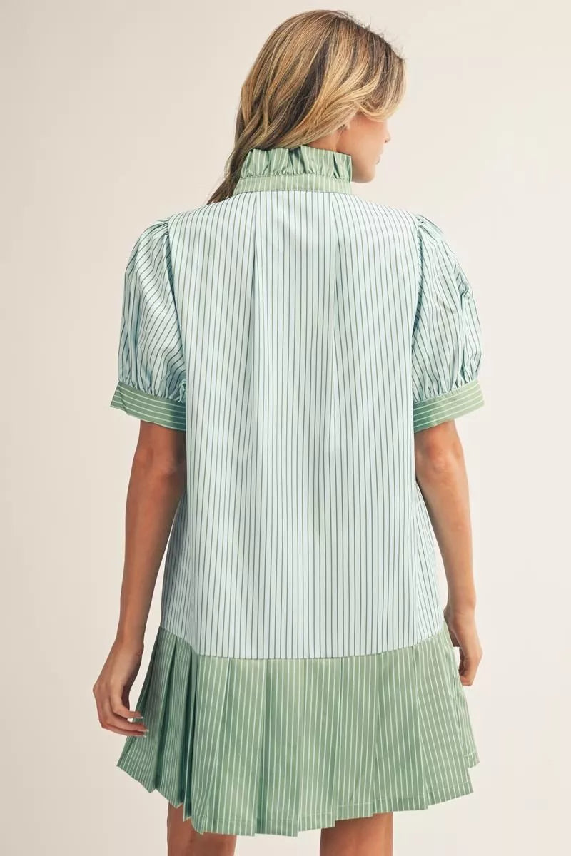 Short puff sleeves stripe dress with pleat hem detail, front button up, ruffle accent.