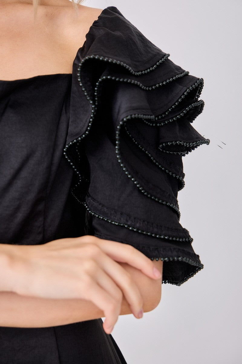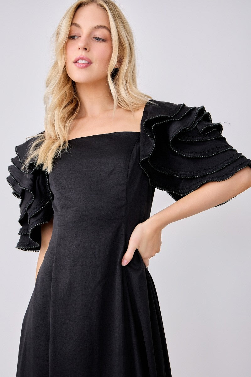 Turn heads with the playful charm of the Payton Dress, featuring eye-catching layered sleeves that bring fun flair to your look. Its square neckline and smocked back add flattering details for a comfortable, stylish fit that dances with every step. Perfect for making a statement wherever you go!