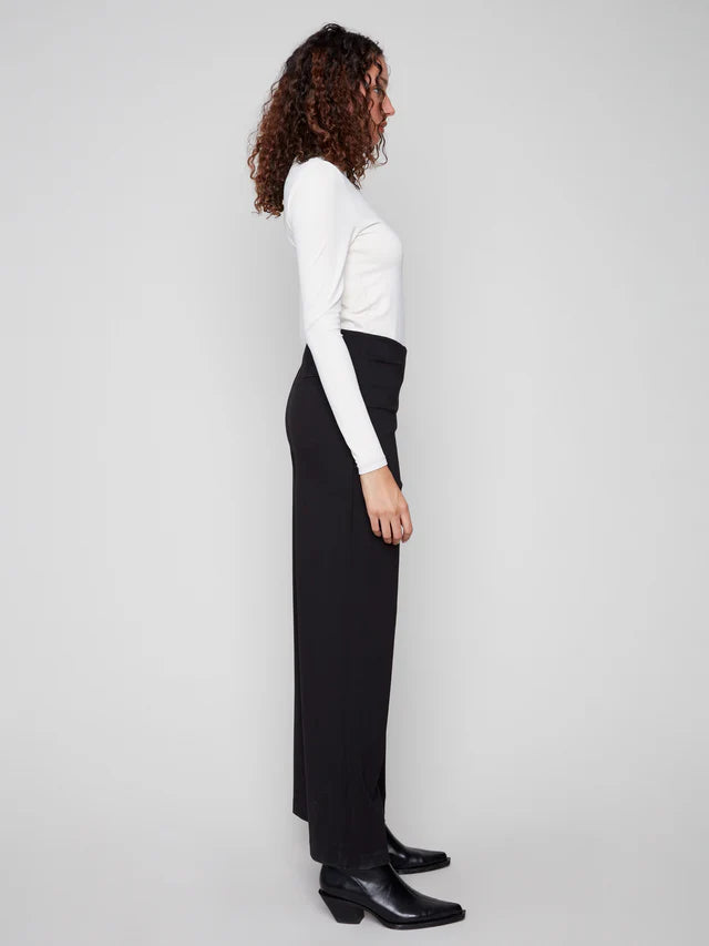 Elevate your wardrobe with these chic black wide-leg pants that combine sophistication and comfort. Featuring a pull-on design, a flattering mid-rise, and an elastic waistband, they offer a perfect fit every time. The expertly blended fabric drapes beautifully while providing flexibility, making them ideal for both the office and relaxed outings. Effortlessly enhance your style with this versatile fall essential.