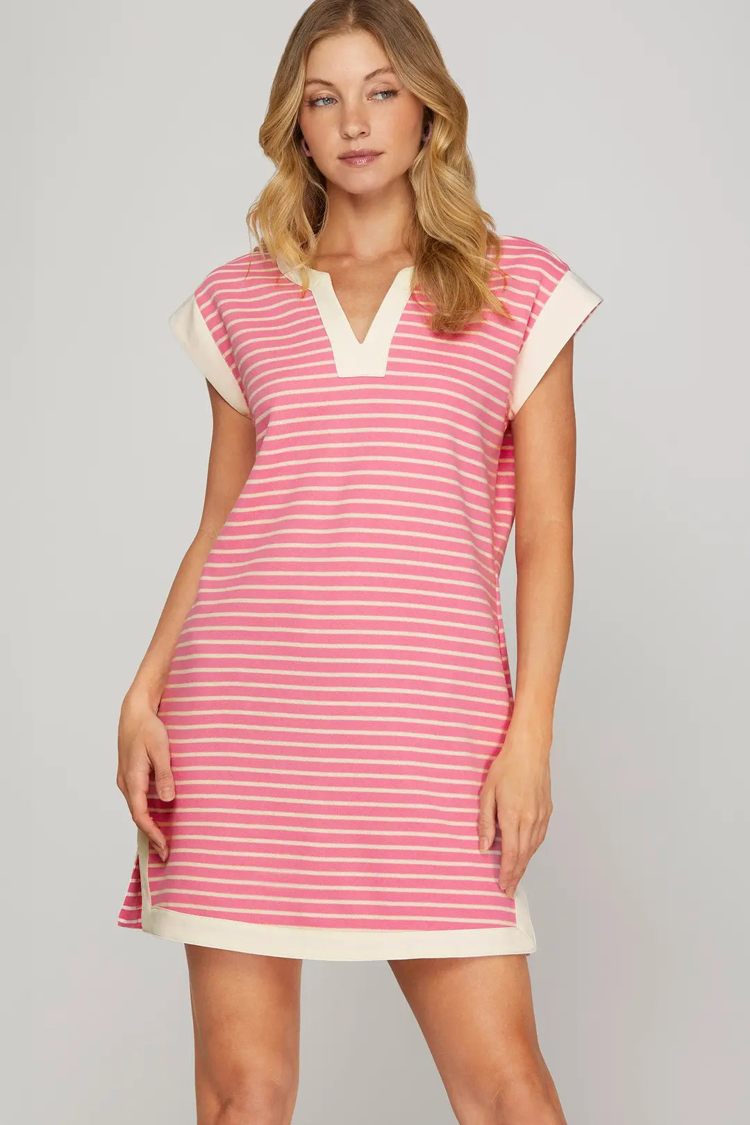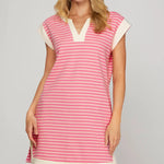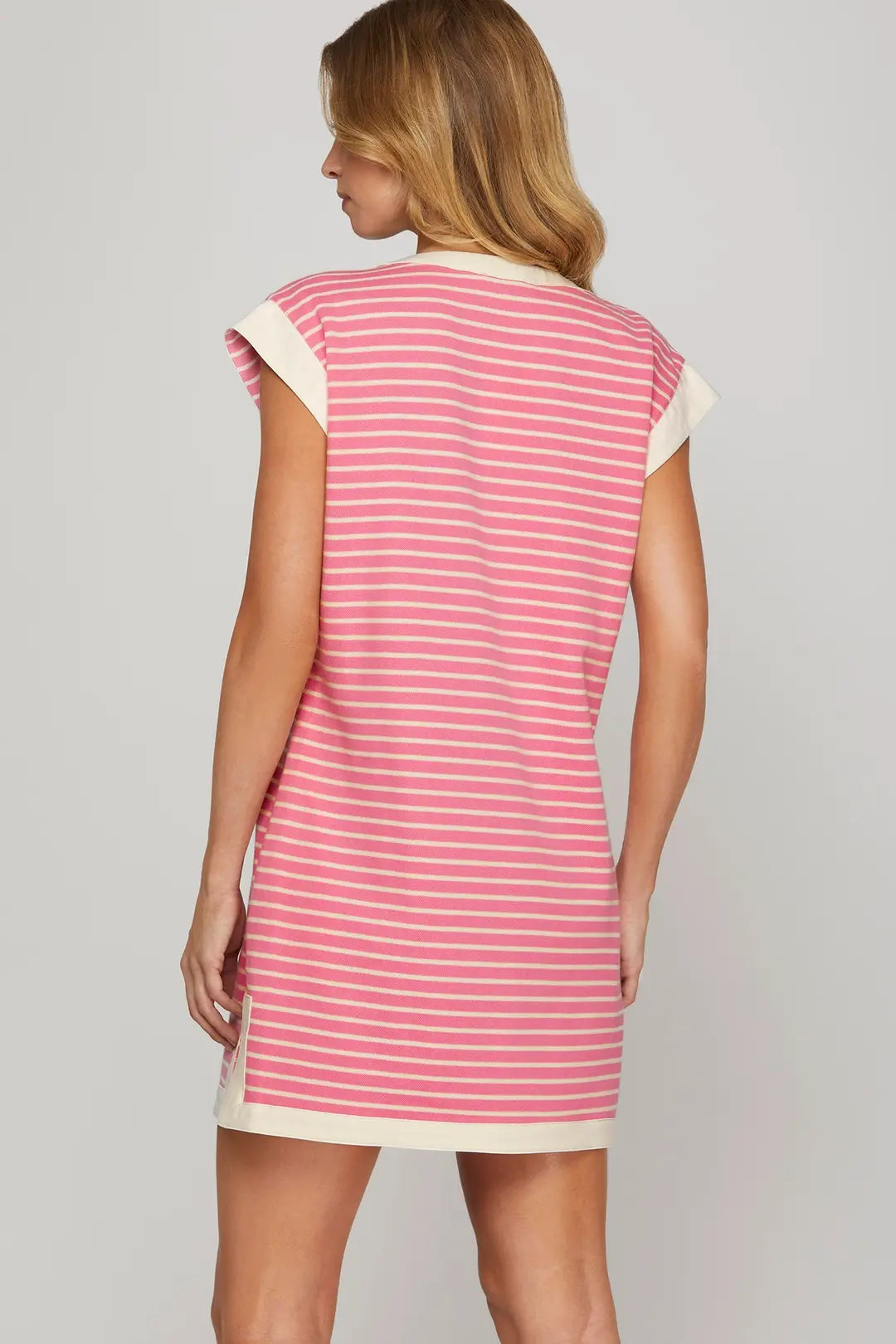 DROP SHOULDER CONTRAST BAND STRIPED DRESS WITH POCKETS
