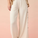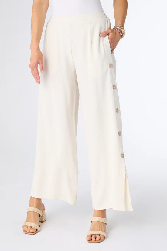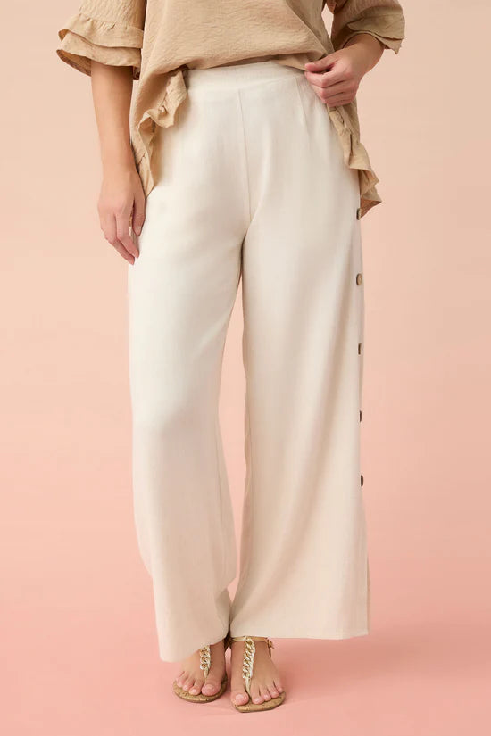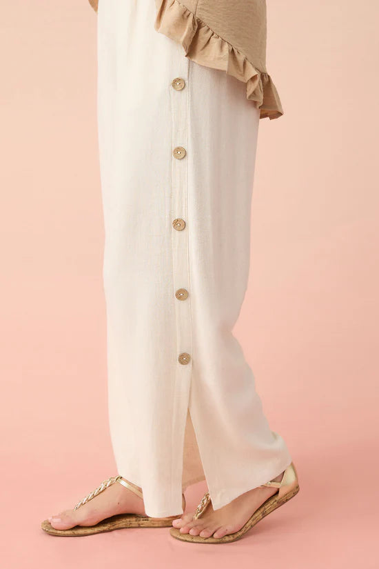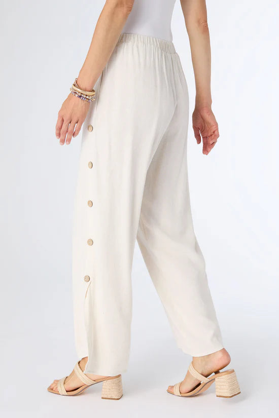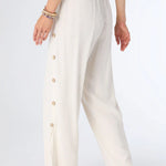 Elevate your summer style with our Remi Pant with Side Button Detail. These flowy and breezy pants feature faux buttons on one pant leg, adding a touch of charm to your outfit. The side slits provide a comfortable and flattering fit, perfect for any summer occasion.