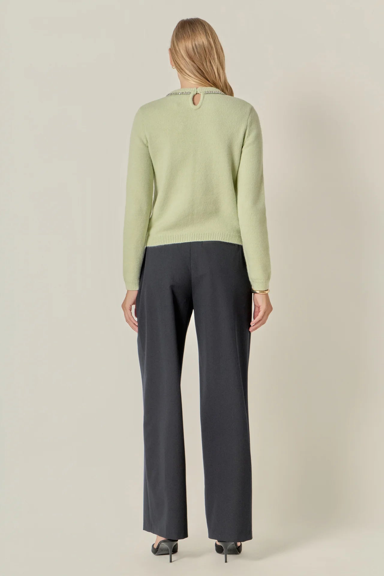 Be effortlessly chic in our Rhinestone Bow Knit top perfect for any occasion. The round neckline and long sleeves make it comfortable and versatile. The eye-catching rhinestone and pearl bow embroidery on the neckline adds a touch of elegance. With a back keyhole and clear button closure it's easy to put on and take off. The elastic closure ensures a perfect fit for all body types. Made with high-quality materials this top is sure to become a staple in your wardrobe. Get ready to turn heads with this must-have top that combines style and comfort.