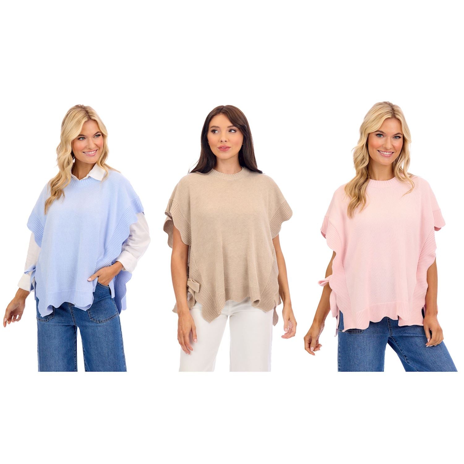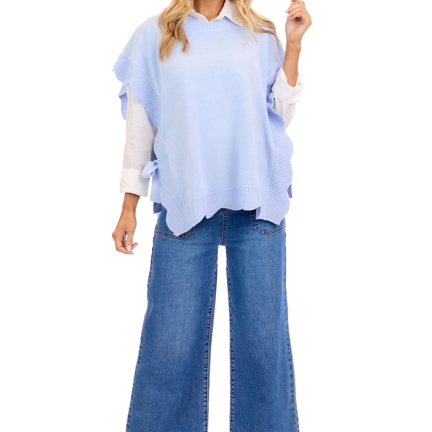 Knitted sleeveless sweater features ribbed neckline, scallop edge hem and adjustable side ties. One size fits most. Measures approximately 25" from shoulder to hem.