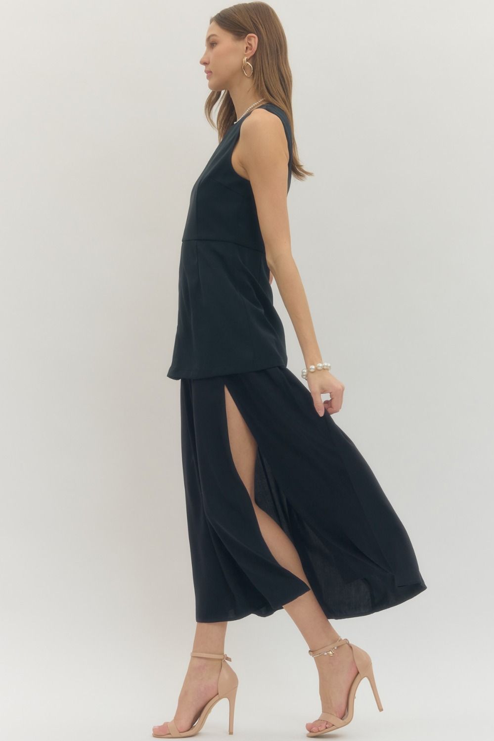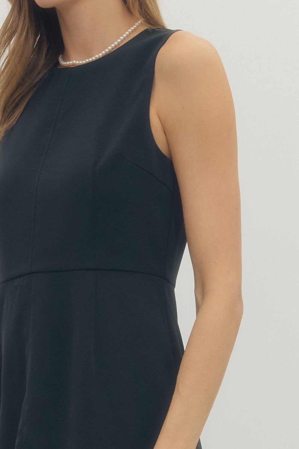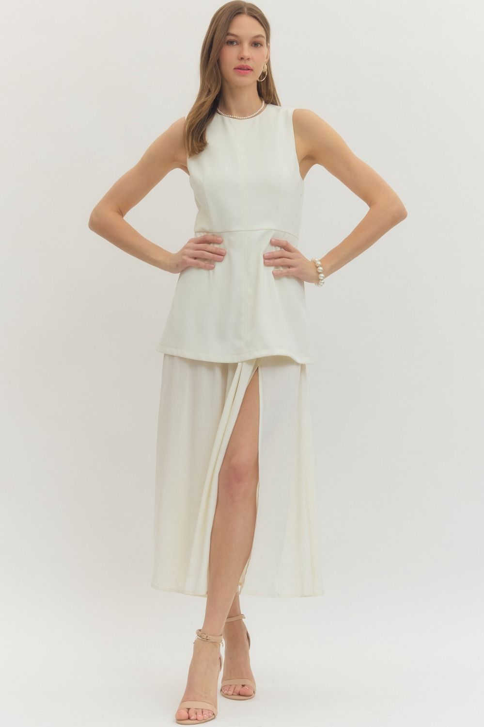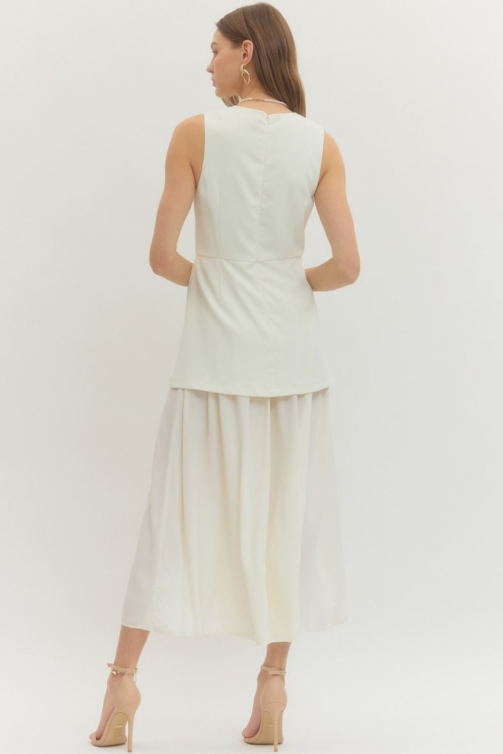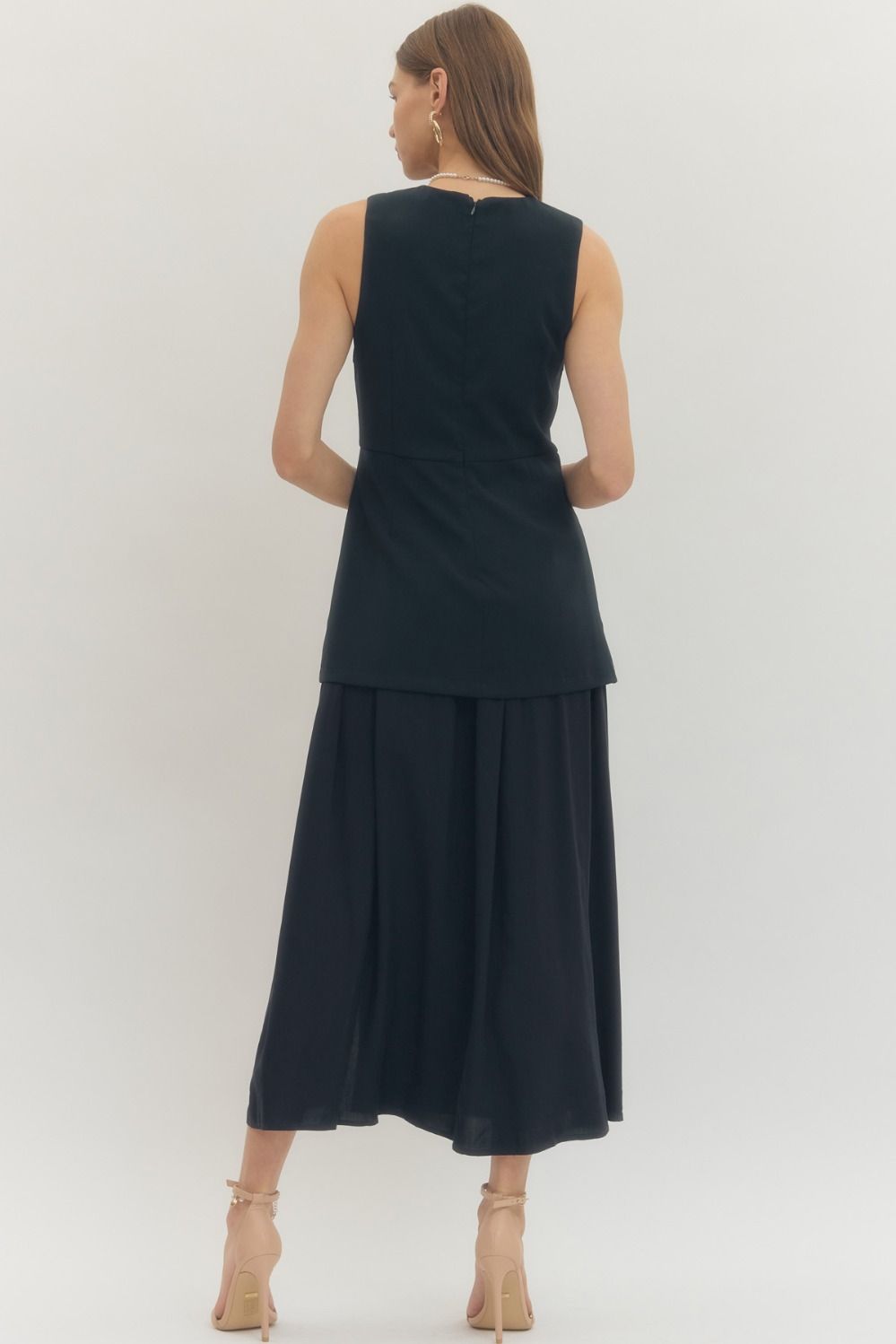 Solid sleeveless midi dress featuring layered two-piece look with concealed back zipper. Pocket at side. Lined. Woven. Non-sheer. Lightweight.
