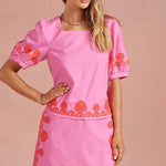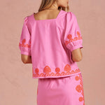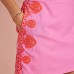 Adorable two-piece skirt set featuring a short-sleeve top paired with a coordinating skirt. Vibrant pink and orange hues create a playful, eye-catching look, while delicate embroidered details add charm and personality. Perfect for adding a pop of color and whimsy to any wardrobe. Ideal for casual outings, playdates, or special occasions where style meets comfort.
