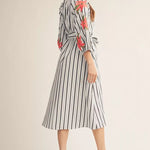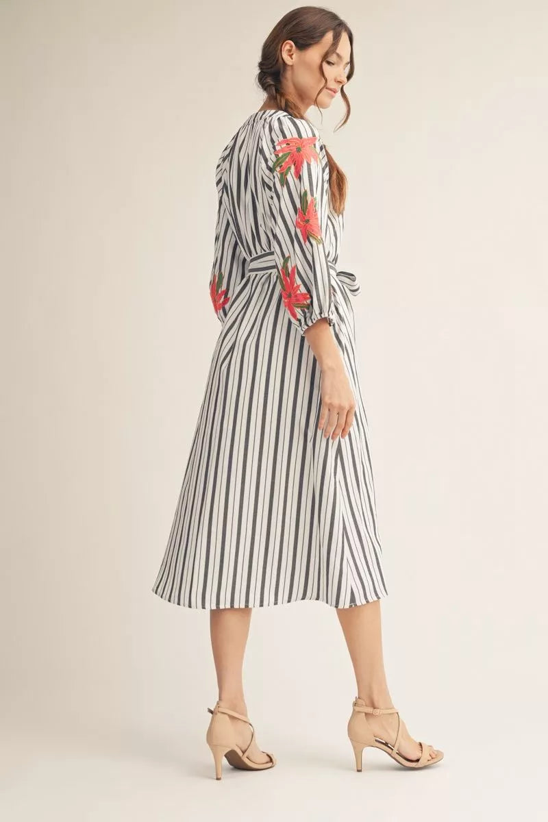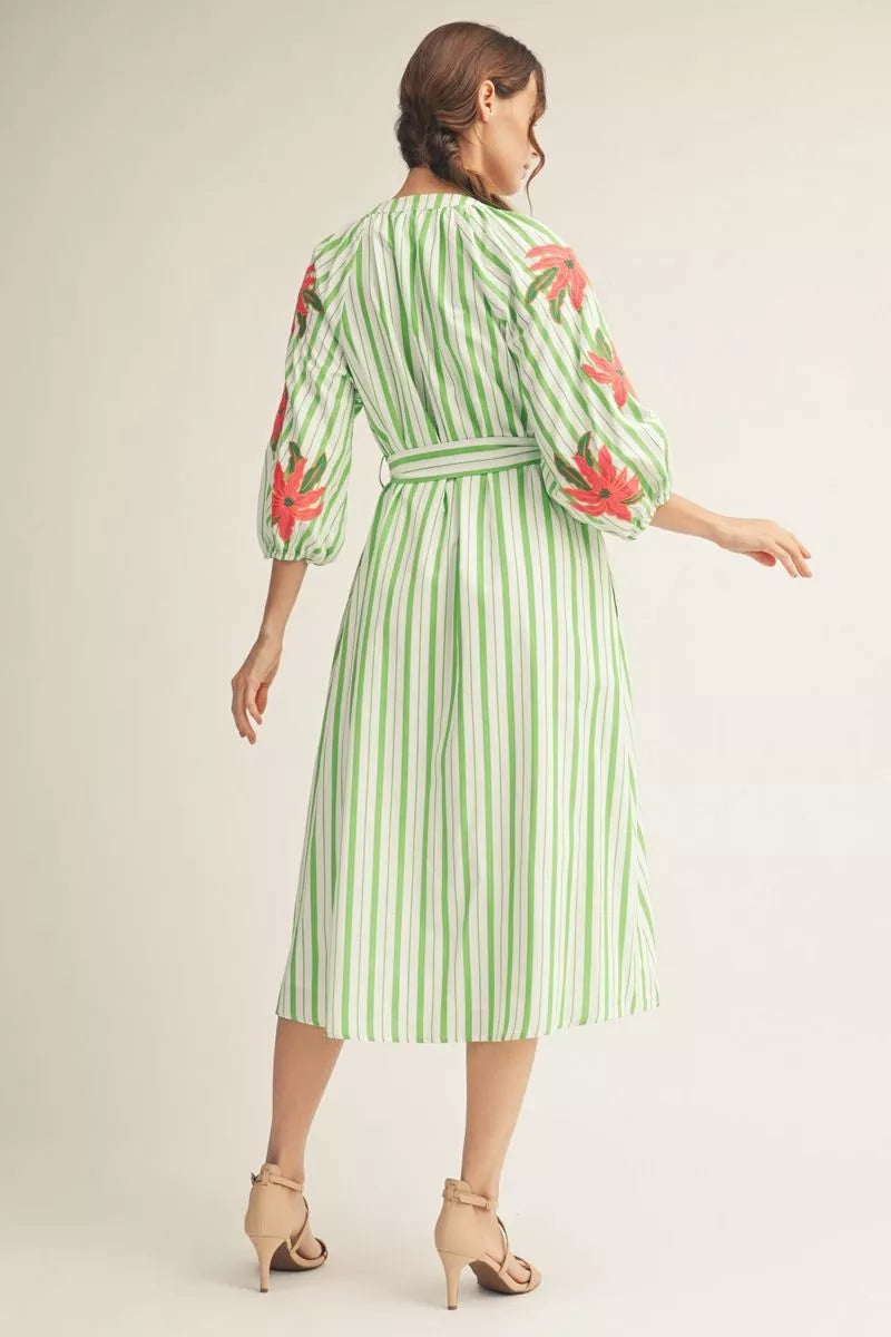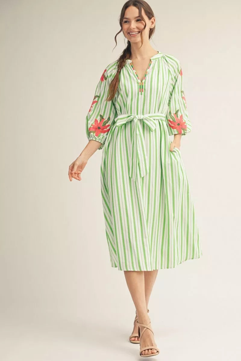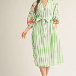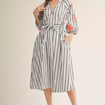 Celebrate the season in this charming midi dress featuring delicate embroidery, crisp stripes, and practical side pockets. The notched V-neckline and adjustable waist tie create a flattering silhouette, while three-quarter sleeves offer versatile coverage. Perfect for Easter gatherings and spring occasions.