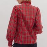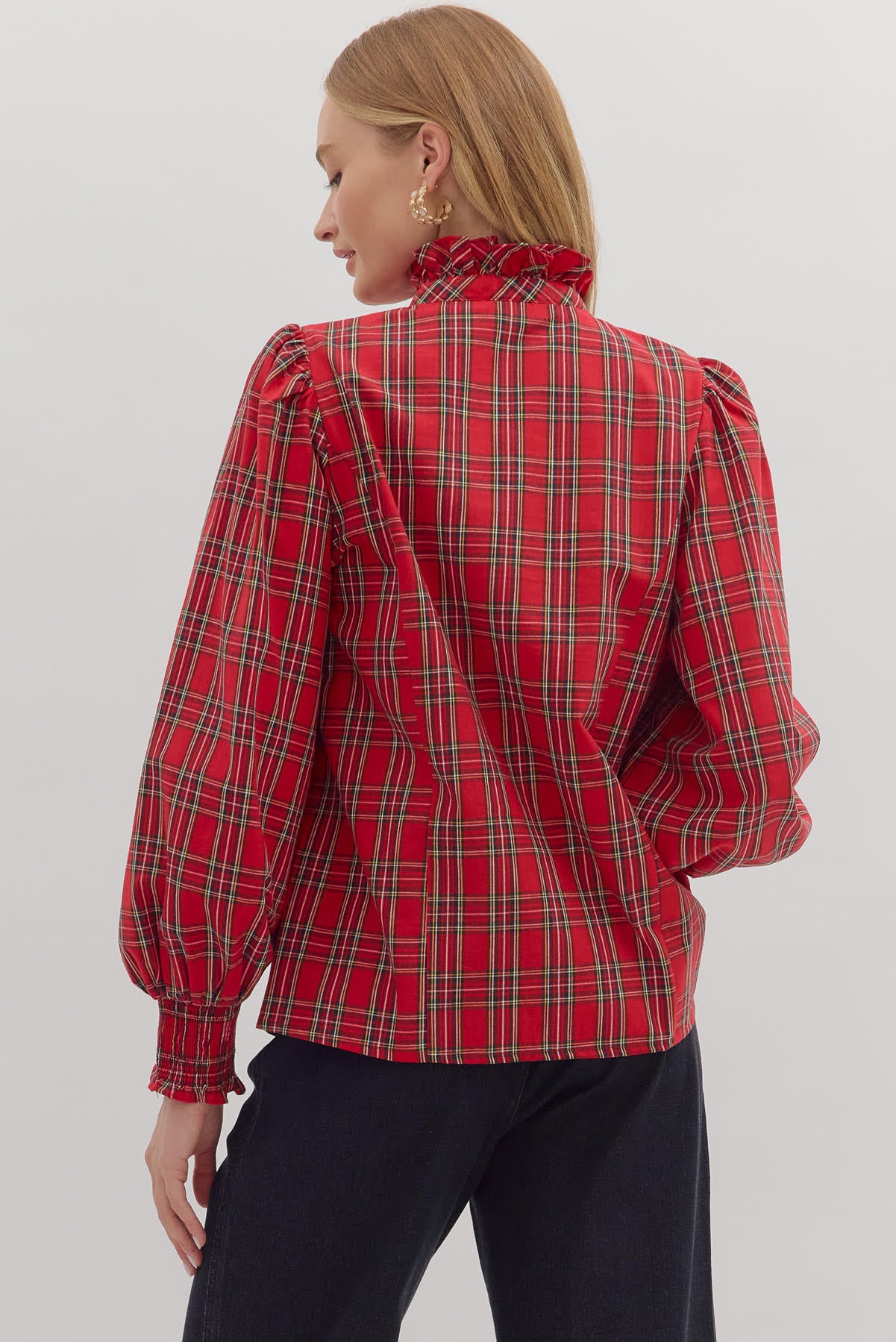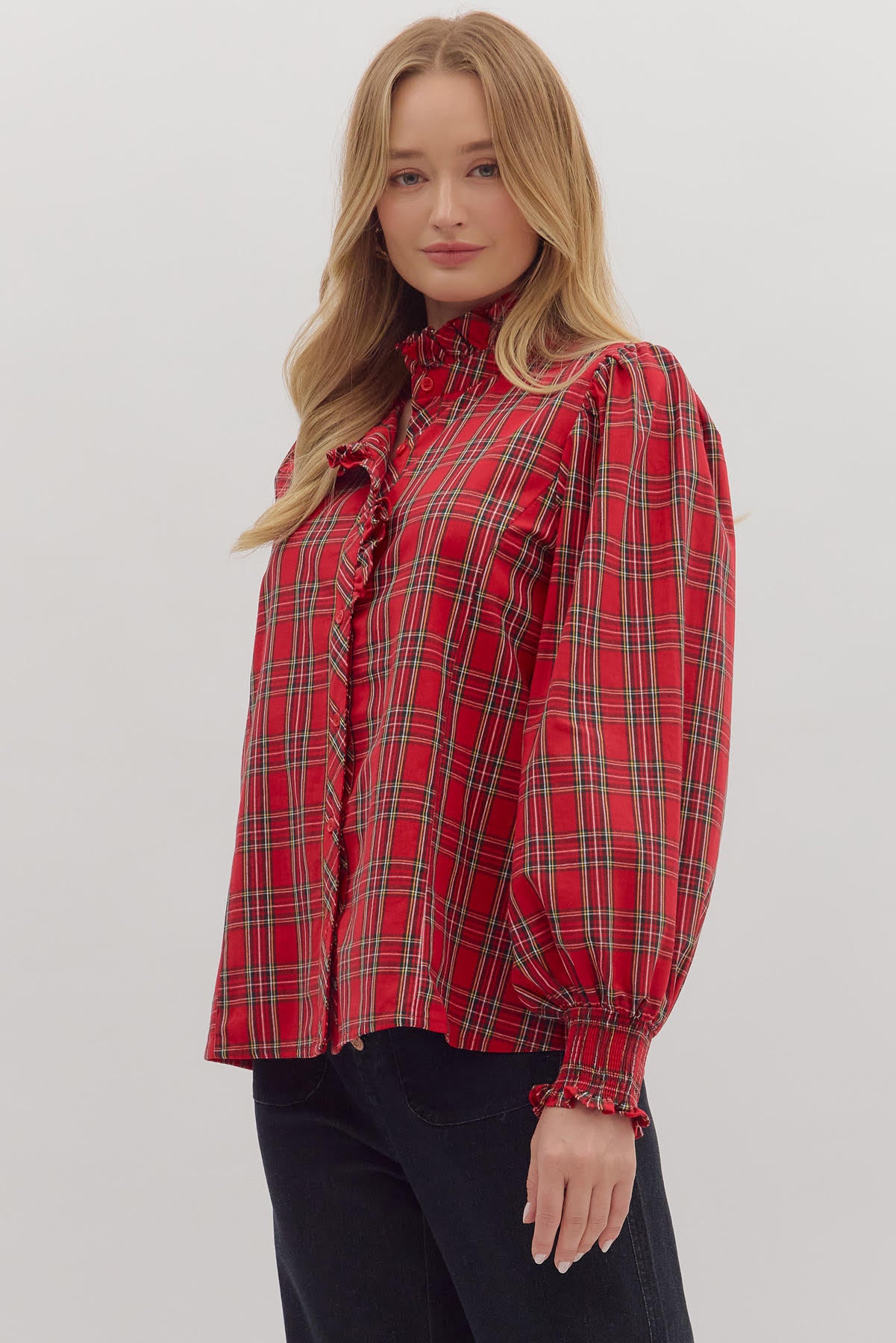 Adorable red plaid top featuring a playful ruffle collar that cascades down the front. Long sleeves make it perfect for holiday celebrations and festive gatherings. A charming choice for adding personality to your seasonal wardrobe.