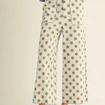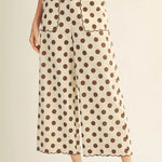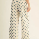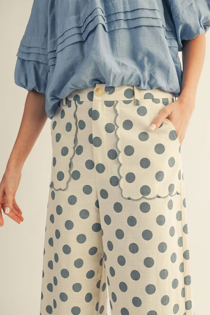 High waist wide leg polka dot pants with embroidered scallop edge detail, pockets.