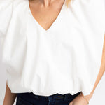 The Shelly Poplin Blouse features a flattering V-neckline and playful bubble sleeves that add movement and dimension to your everyday wardrobe. Crafted from crisp solid poplin fabric, this blouse offers a polished look that transitions seamlessly from office to weekend. The structured material holds its shape beautifully while remaining comfortable for all-day wear. Perfect layered under a blazer or worn solo, this versatile piece pairs effortlessly with jeans, trousers, or skirts for endless styling possibilities.