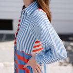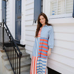 Effortlessly coastal with a modern twist, the Sienna Midi Dress is crafted from a soft linen blend that’s lightweight, breathable, and perfect for warm-weather days. Designed with a relaxed button-front silhouette, this midi features a playful mix of classic stripes in fresh Nantucket-inspired hues for an eye-catching patchwork effect. Easy yet refined, it’s a go-to piece for seaside strolls, summer gatherings, and everyday wear.