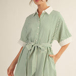 Effortlessly chic and endlessly versatile, the Sloane Striped Romper is your new go-to for casual days that demand style. The classic stripe pattern pairs perfectly with the adjustable tie belt, letting you cinch and customize your silhouette however you like. Whether you're running errands, meeting friends, or just living your best everyday life, this romper delivers comfort without compromising on looks. One piece, infinite possibilities.