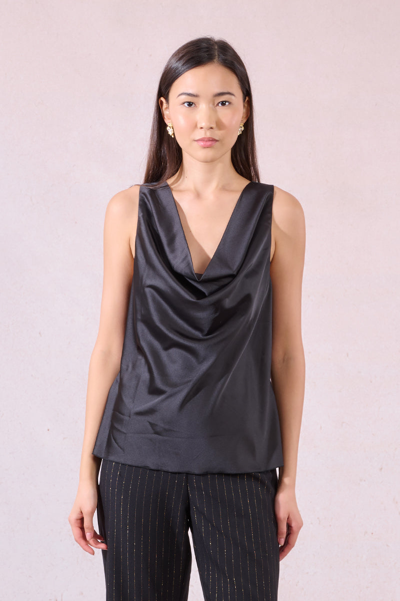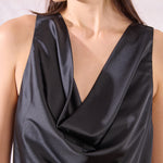 The shirt is a sleeveless satin top with a smooth, glossy finish. It features a draped cowl neckline that creates soft folds across the chest. The fabric has a fluid, slightly loose fit that adds elegance and movement. It’s styled with a clean, minimal hemline and pairs well with tailored bottoms for a refined look.