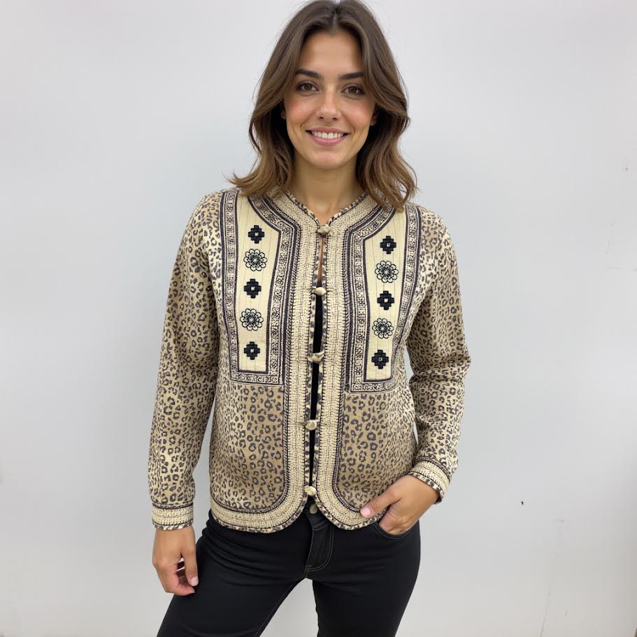 This adorable quilted jacket boasts a bold leopard print and buttons down the front for easy wear. Its flattering shape adds a fun, stylish twist to your outfit, making it perfect for those who love a playful edge with cozy comfort.