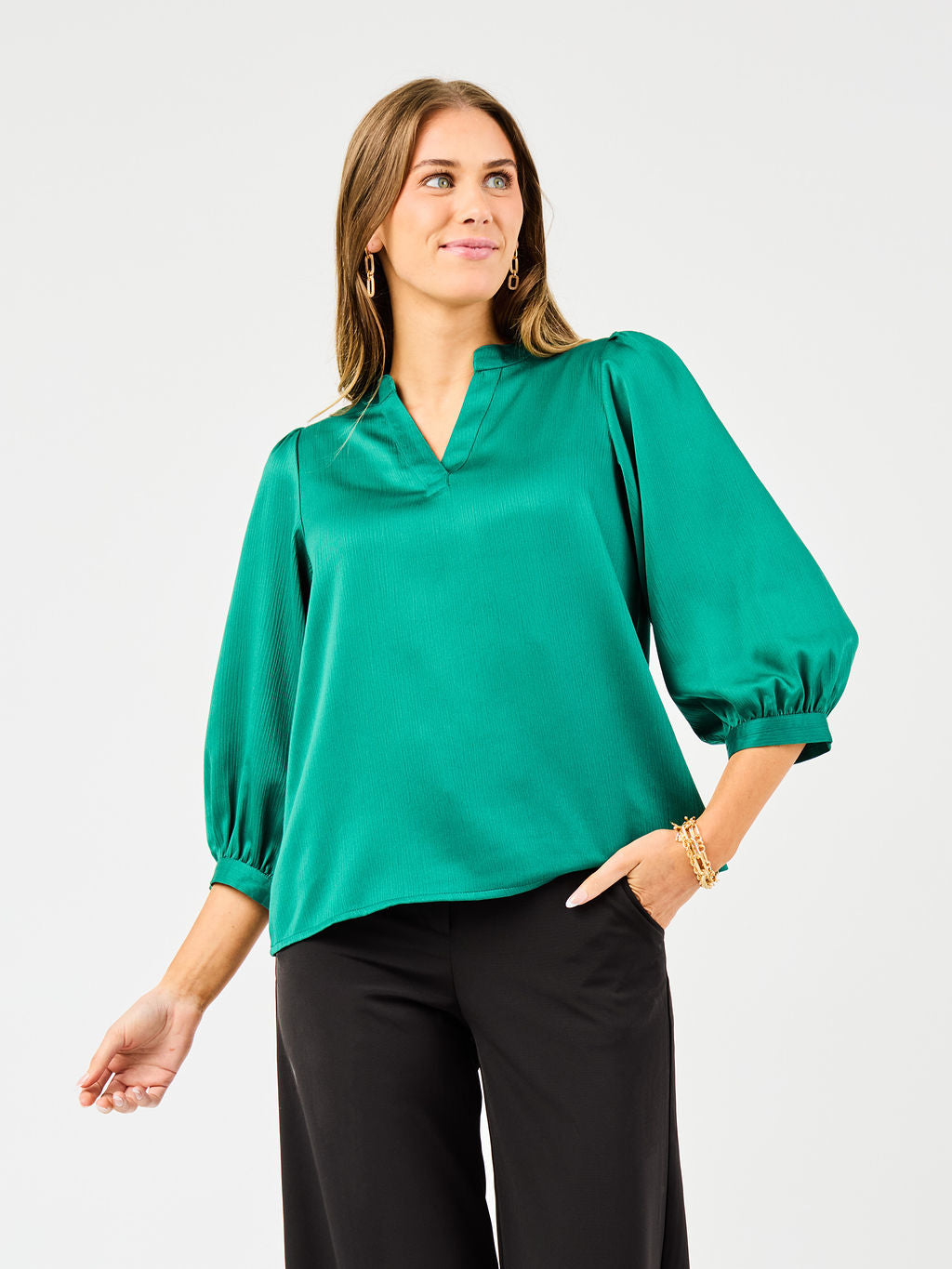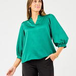 Get ready to turn heads this holiday with the Tamryn Top! Its cheerful green hue and flirty 3/4 length sleeves make it perfect for festive gatherings. Stylish and comfortable, this top brings playful charm to your seasonal wardrobe.