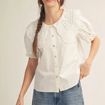 Charming button-down top featuring delicate short puff sleeves and an eyelet Peter Pan collar. Perfect for adding a touch of vintage-inspired elegance to any wardrobe.