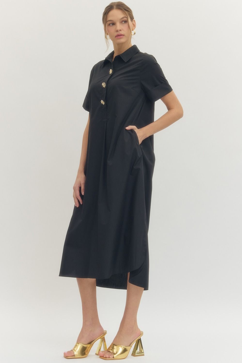 Effortless style meets everyday comfort in this charming midi dress. The crisp shirt collar and snap-button front give it a polished, put-together vibe, while turn-up cuffs and side pockets add practical flair. An inverted pleat at the back creates graceful movement, and the lightweight woven fabric keeps you cool and comfortable all day long. Fully lined and non-sheer for confidence. Perfect for casual outings or dressing up with the right accessories.