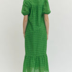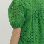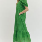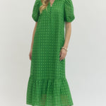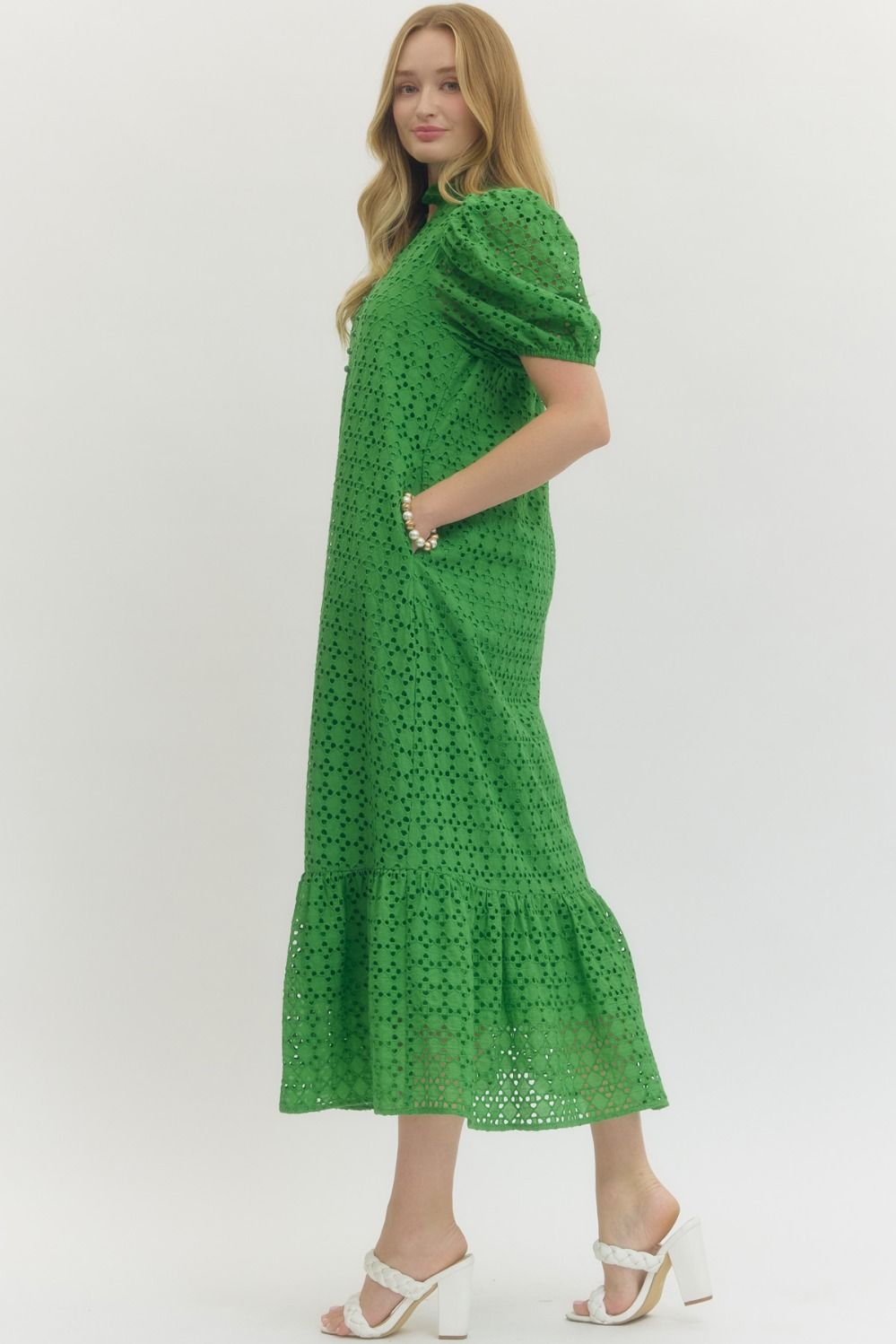 Twirl into spring with this charming eyelet midi dress! Delicate puff sleeves and a ruffled mock neck add romantic flair, while the matching ruffle hem keeps the fun going all the way down. Practical front button closure and hidden side pockets mean you can actually carry your essentials—no tiny purse required. The lightweight woven fabric feels breezy against your skin, and the full lining ensures you're covered without any see-through surprises. Perfect for garden parties, brunch dates, or whenever you want to feel effortlessly put-together with a playful twist.