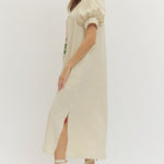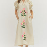 Stripes meet florals in this breezy midi dress that's ready for anything. The front floral embroidery adds a touch of whimsy, while the band collar and V-cut neckline keep things fresh and flattering. Side pocket? Yes, please. Lightweight woven fabric means you'll stay comfortable all day, and the unlined cut gives it an effortless, relaxed vibe. Perfect for casual outings or dressed-up moments.