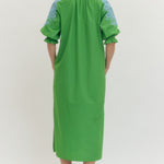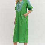 Slip into effortless elegance with this embroidered V-neck midi dress—the perfect blend of comfort and style. Contrast trim frames the neckline and half sleeves, while practical side pockets keep your essentials close. Flowy side slits add movement without the fuss, and the lined, lightweight woven fabric keeps you cool all day long. Non-sheer and polished, it's your go-to for looking put-together without trying too hard.
