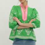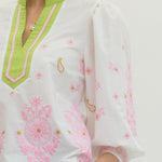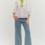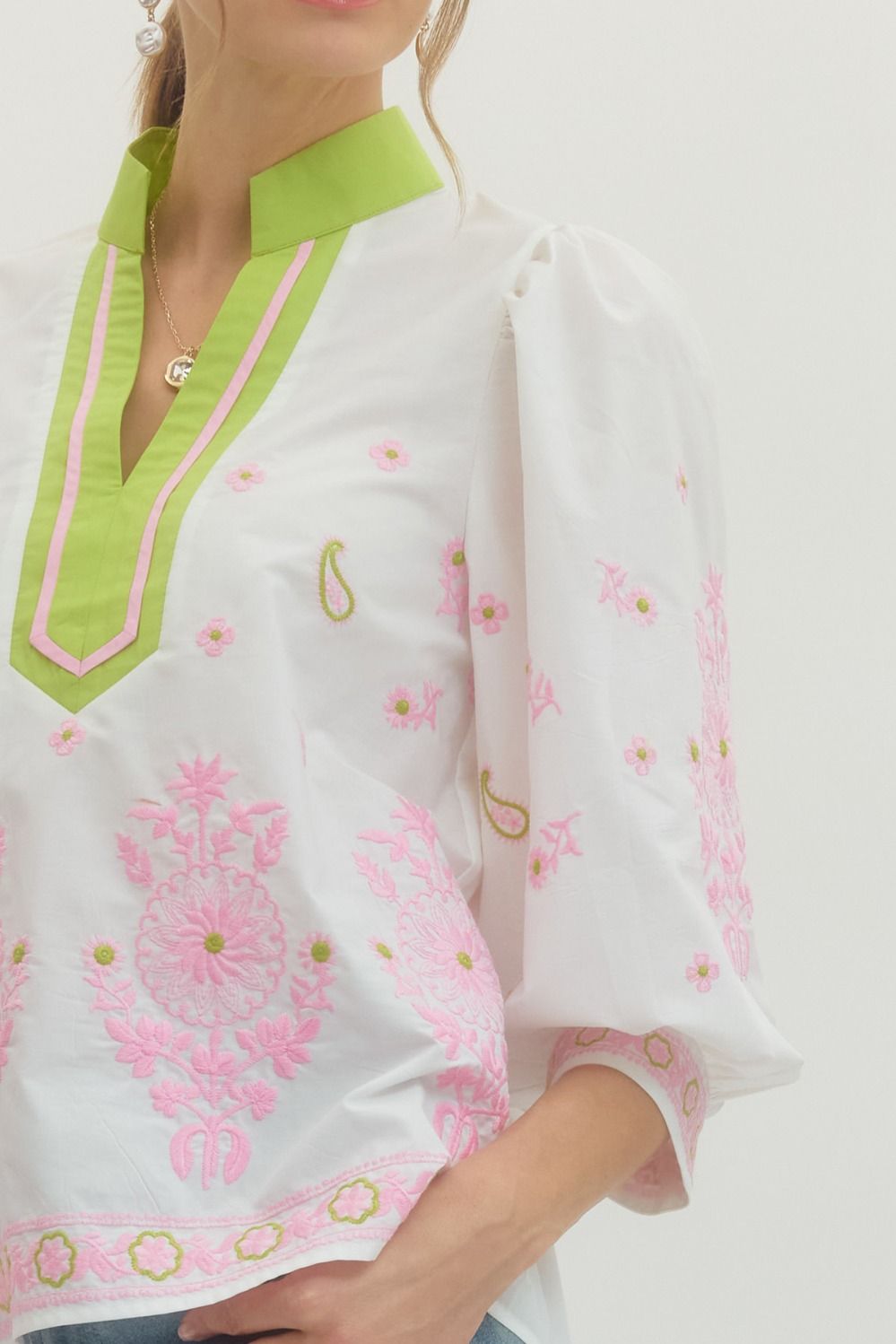 Elevate your everyday style with this charming floral embroidered top! The playful 3/4 puff sleeves add a touch of whimsy, while the contrast V-neck band collar keeps things polished and put-together. Crafted from lightweight woven fabric that's unlined and beautifully non-sheer, it's perfect for layering or wearing solo. Whether you're heading to brunch or a casual day out, this piece brings effortless charm to any outfit.