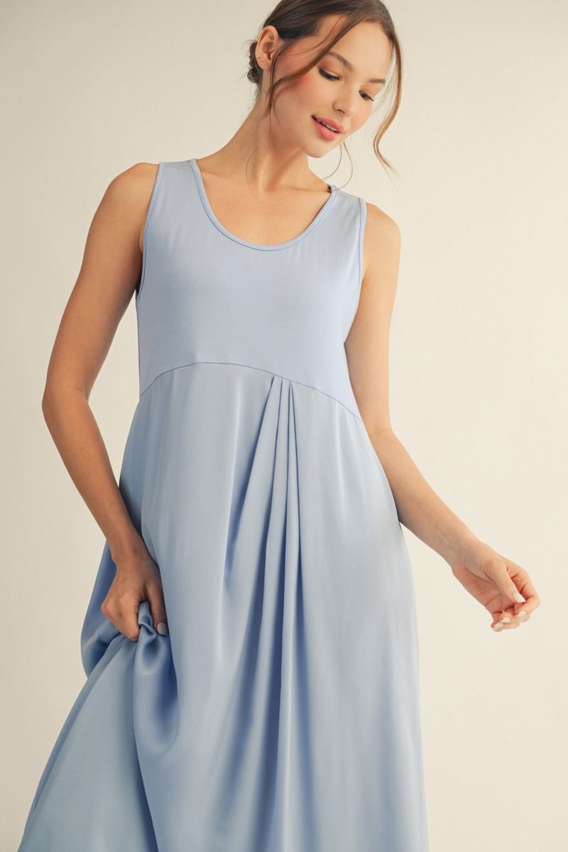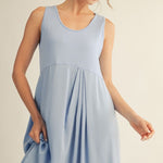 Effortless elegance meets modern design in this sleeveless midi dress. Crafted from a quality fabric blend, it features a flattering front pleat detail and asymmetrical cut hem that adds movement and visual interest. The sleeveless silhouette keeps it light and versatile, perfect for layering or wearing solo. Mix and match with your favorite accessories for endless styling possibilities. A timeless piece that transitions seamlessly from day to evening.