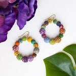 A fresh take on our Kantha Jewelry, the Threaded Kantha Collection features a colorful, textured wrap technique. The artisans first cut the repurposed Kantha fabric into long strips, wrap them with colorful cotton thread, and then cover oval-shaped beads with the textured strips. The Kantha and thread-wrapped beads are incredibly colorful, and are interspersed with traditional round Kantha beads to form the Threaded Kantha Hoops.