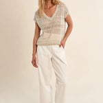 Effortless style meets comfort in this open knit sweater. Featuring short sleeves and a flattering V-neck, the semi-sheer construction creates an airy, breathable feel perfect for layering or wearing solo. Ideal for casual everyday wear, this piece transitions seamlessly from season to season. The relaxed fit and delicate knit texture add understated sophistication to any wardrobe.