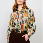 The top in the image is a vibrant, statement-making button-up shirt featuring a colorful, all-over print of various architectural windows and doors. The design evokes a charming, urban European cityscape, with each illustrated façade boasting different styles, colors, and textures. Made from a lightweight fabric, the shirt has a structured collar, long sleeves with buttoned cuffs, and a classic front button closure. The eclectic mix of warm and cool tones—ranging from ochre and terracotta to teal and magenta—adds a playful and artistic flair. Ideal for those who enjoy bold, conversation-starting fashion pieces.