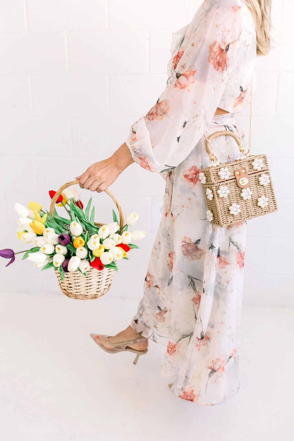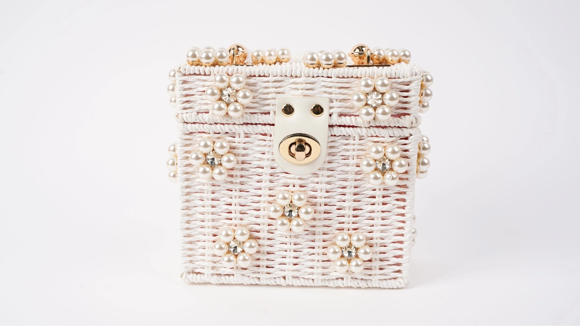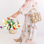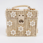 The most adorable wicker bucket bag with bejeweled flowers. Naturally woven basket bag with the cutest lining ever!  Comes with long gold chain so it can be worn as shoulder bag. available in 2 colors:  white and natural.